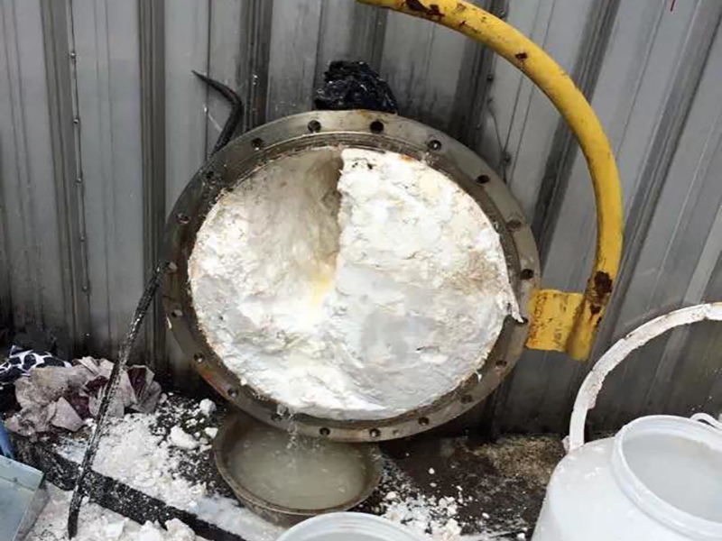 自原始开车以来甲醛储罐未进行清理,截止到目前甲醛储罐液位低于150吨,会出现频繁清理滤网现象,根据甲醛的性质,判断甲醛储罐底部出现结垢需要进